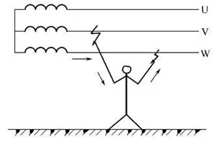 兩相觸電是指人體同時接觸設(shè)備或線路中的兩相導(dǎo)體而發(fā)生的觸電現(xiàn)象。若人體觸及一相火線、一相零線,人體承受的電壓為220V;若人體觸及兩根火線,則人體承受的電壓為線電壓380V。兩相觸電對人體的危害更大。