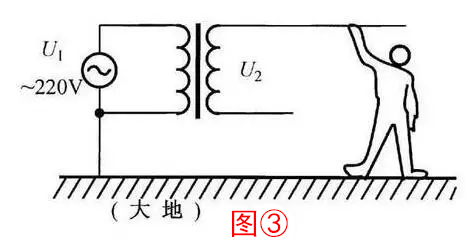 4、電源變壓器的另一用途是電源隔離。由于變壓器的隔離作用,即使人體接觸到電壓U2,也不會與交流220V市電構(gòu)成回路,保證了人身安全(圖③)。這就是維修熱底板家電時必須要用電源隔離變壓器的道理。