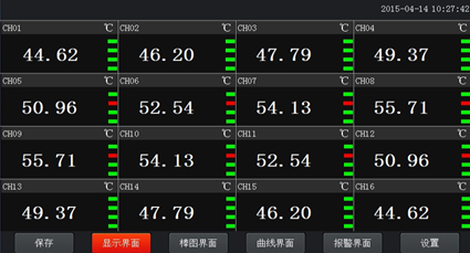 在界面底端有六個(gè)按鈕(保存、顯示、棒圖、曲線界面、報(bào)警界面、設(shè)置)。