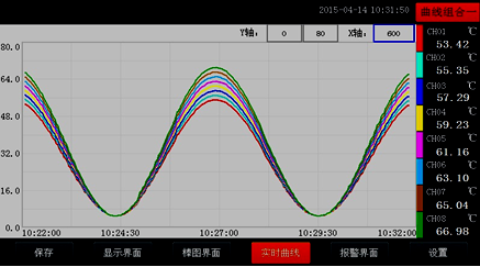 當(dāng)前曲線記錄只保留單屏的顯示數(shù)據(jù),可根據(jù)觀察的需要,通過改變Y軸和時標(biāo)X軸來改變顯示刷新的速度,各條曲線一致,并不影響FLASH記錄的時間間隔。