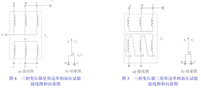當被試三相變壓器低壓繞組的各端子都能引出時,可以采用圖 8 和圖9的接線。圖 8接線只適用于三鐵芯柱變壓器,這種情況下,高壓側被試相相間和對地電壓達試驗電壓 Us中性點電壓達試驗電壓的 1/3;