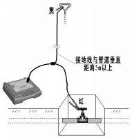 接地釬位置的選擇:為保證探測(cè)效果,接地釬應(yīng)與管線距離5m以上,而且黑色接地導(dǎo)線應(yīng)盡量和管線方向垂直。