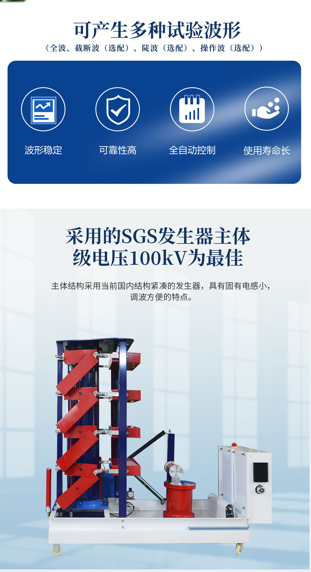 1、采用的SGS發(fā)生器主體,級(jí)電壓為100kV,符合當(dāng)前國(guó)內(nèi)外的發(fā)展趨勢(shì)。主體結(jié)構(gòu)采用當(dāng)前國(guó)內(nèi)結(jié)構(gòu)緊湊的發(fā)生器,具有固有電感小,調(diào)波方便的特點(diǎn)。