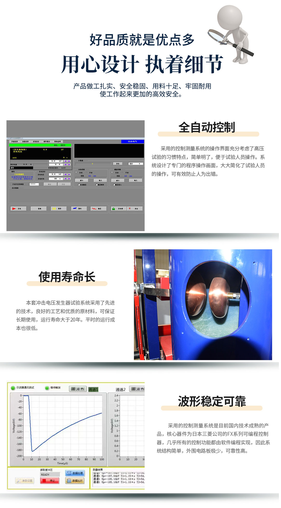 6、本套沖擊電壓發(fā)生器試驗(yàn)系統(tǒng)采用了先進(jìn)的技術(shù),良好的工藝和優(yōu)質(zhì)的原材料,可保證長(zhǎng)期使用,運(yùn)行壽命大于20年。平時(shí)的運(yùn)行成本也很低。