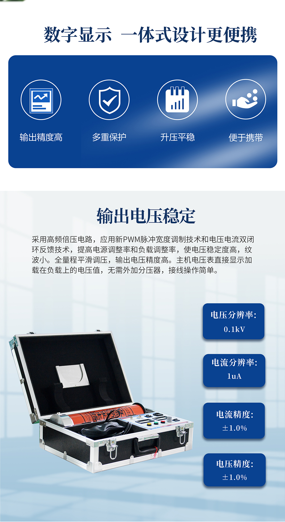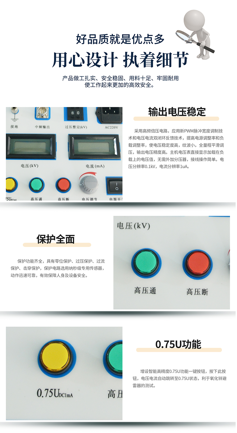 本儀器采用高頻倍壓電路,應(yīng)用新PWM脈沖寬度調(diào)制技術(shù)和電壓電流雙閉環(huán)反饋技術(shù),提高電源調(diào)整率和負(fù)載調(diào)整率,使電壓穩(wěn)定度高,紋波小。使用進(jìn)口大功率IGBT器件及其驅(qū)動技術(shù),消除開關(guān)干擾,實現(xiàn)直流高壓發(fā)生器的高品質(zhì)和便攜性。選用進(jìn)口高頻高壓整流二極管,使倍壓筒更加小巧輕便,提升整機效率。根據(jù)EMI電磁干擾和EMC電磁兼容理論,采用屏蔽、隔離和接地等措施,提升整機安全性,并能承受額定電壓放電而不損壞。儀器保護(hù)功能齊全,具有零位保護(hù)、過壓保護(hù)、過流保護(hù)、擊穿保護(hù),保護(hù)電路選用納秒級專用傳感器,動作迅速可靠,有效保障人身及設(shè)備安全。過壓整定選用數(shù)字撥碼開關(guān),操作簡單并具有較高的整定精度。增設(shè)智能高精度0.75U功能按鈕,利于氧化鋅避雷器的測試。