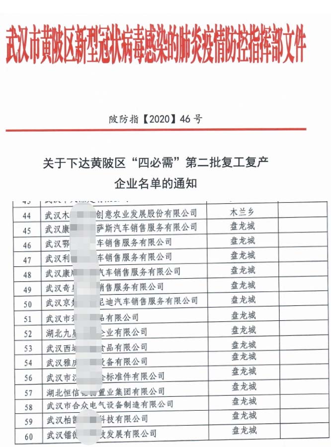 經(jīng)過黃陂區(qū)疫情防控指揮部的批準(zhǔn),在黃陂區(qū)管委會(huì)及區(qū)經(jīng)濟(jì)和信息化局的協(xié)調(diào)和大力支持下,武漢市合眾電氣收到了黃陂區(qū)“四必需”第二批復(fù)工復(fù)工企業(yè)名單的通知。