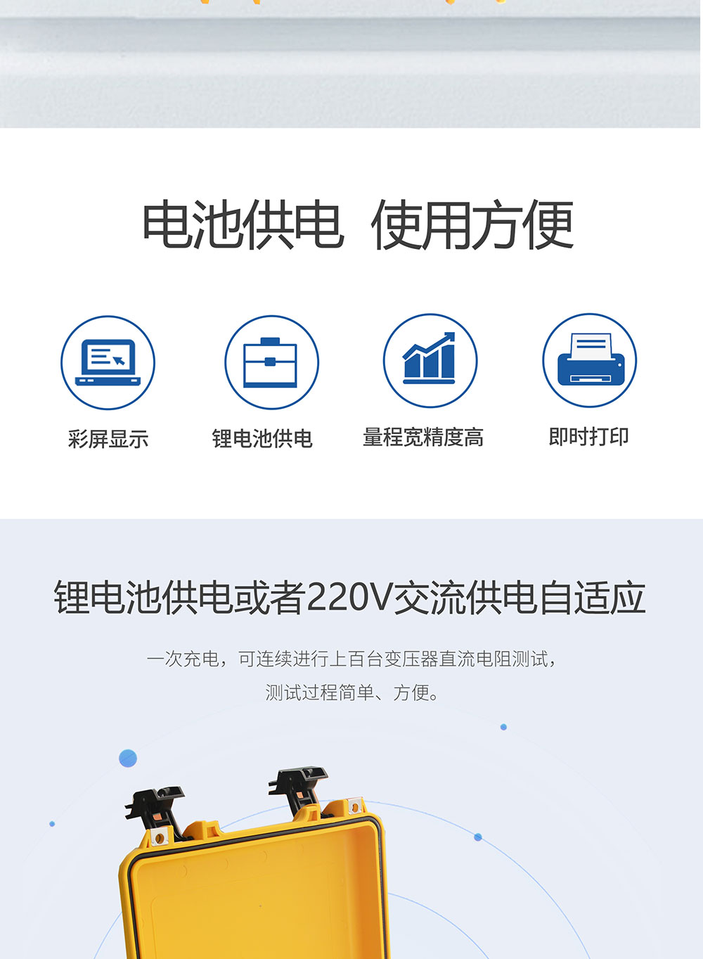 1、鋰電池供電或者220V交流供電自適應(yīng),一次充電,可連續(xù)進(jìn)行上百臺變壓器直流電阻測試,測試過程簡單、方便。