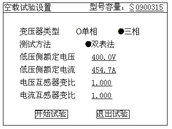 2)在變壓器綜合測試儀主界面中選擇空載試驗(yàn),則顯示空載試驗(yàn)設(shè)置界面如下圖: