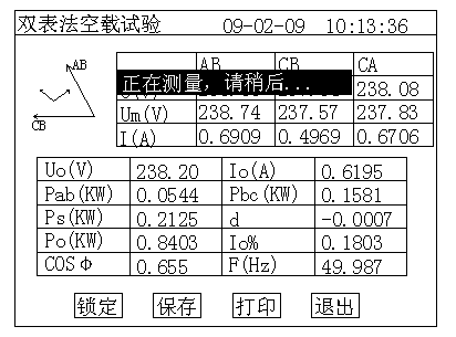 左上側(cè)為試驗(yàn)電壓、電流的向量圖,如果接線錯誤,該頁面提示“接線錯誤,請關(guān)機(jī)檢查”;通過調(diào)壓器緩慢增加試驗(yàn)電壓,當(dāng)Uo(V)等于空載試驗(yàn)的額定電壓時,停止升壓。移動光標(biāo)到“鎖定”按鈕,長按OK鍵將出現(xiàn)圖9正在測量的提示,此時保持調(diào)壓器不動,當(dāng)圖9中的正在測量的提示消息消失后,當(dāng)前測試結(jié)果已經(jīng)被鎖定,然后“鎖定”按鈕變?yōu)椤爸販y”按鈕,此時請迅速操作調(diào)壓器降壓至零位。