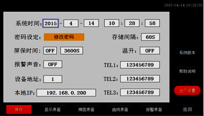 系統(tǒng)參數設置包括:日期、記錄間隔、密碼設定、網口通訊IP設定、蜂鳴器報警、溫升、屏保、設備地址。