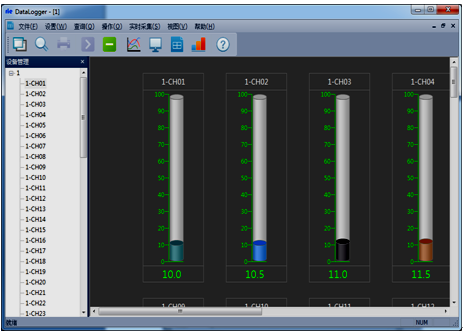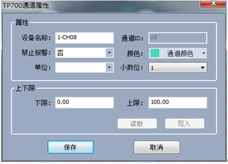 各個(gè)通道的參數(shù)可在設(shè)備管理區(qū)域內(nèi),選擇相應(yīng)的通道點(diǎn)擊鼠標(biāo)右鍵設(shè)備屬性進(jìn)行設(shè)置。如下圖2-13通道屬性設(shè)置,在此窗口內(nèi)可設(shè)置通道名稱,禁止報(bào)警,顯示顏色,通道單位,顯示小數(shù)位數(shù)等,并能夠向下位機(jī)讀取或者寫(xiě)入通道的下限和上限等操作。