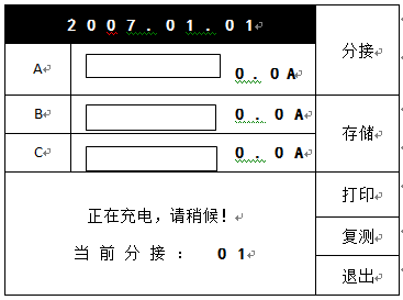 選擇好測量電流,接好三相接線,在初始界面狀態(tài)下按“測量”鍵后,直阻儀進入測量狀態(tài),開始給繞組供電。并進入如下界面: