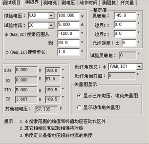 微機(jī)繼電保護(hù)測試儀的測邊界作者:合眾電氣發(fā)布時(shí)間:2021-08-16瀏覽量:3946 次字體顯示:【大】【中】【小】 微機(jī)繼電保護(hù)測試儀的測邊界。 測邊界 自動(dòng)測試出方向性保護(hù)的兩個(gè)動(dòng)作邊界,并且自動(dòng)計(jì)算出最大靈敏角。在“顯示動(dòng)作角矢量圖”的顯示方式下,從主界面右側(cè)的圖中可以很直觀地觀察到兩條邊界線和最大靈敏線。上一篇: 微機(jī)繼電保護(hù)測試儀試驗(yàn)參量下一篇: 微機(jī)繼電保護(hù)測試儀測試項(xiàng)目的界面說明