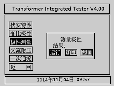 在CT測試主界面中光標(biāo)選擇極性測量選項(xiàng),點(diǎn)擊旋轉(zhuǎn)鼠標(biāo)進(jìn)入CT極性測量界面如圖3.22所示。CT極性試驗(yàn)接線與CT變比極性試驗(yàn)接線方式相同,按下互感器綜合特性測試儀運(yùn)行后,儀器會(huì)自動(dòng)檢測所連接CT的極性。選擇打印選項(xiàng)則將試驗(yàn)結(jié)果打印,選擇返回選項(xiàng)則返回至CT試驗(yàn)主界面。