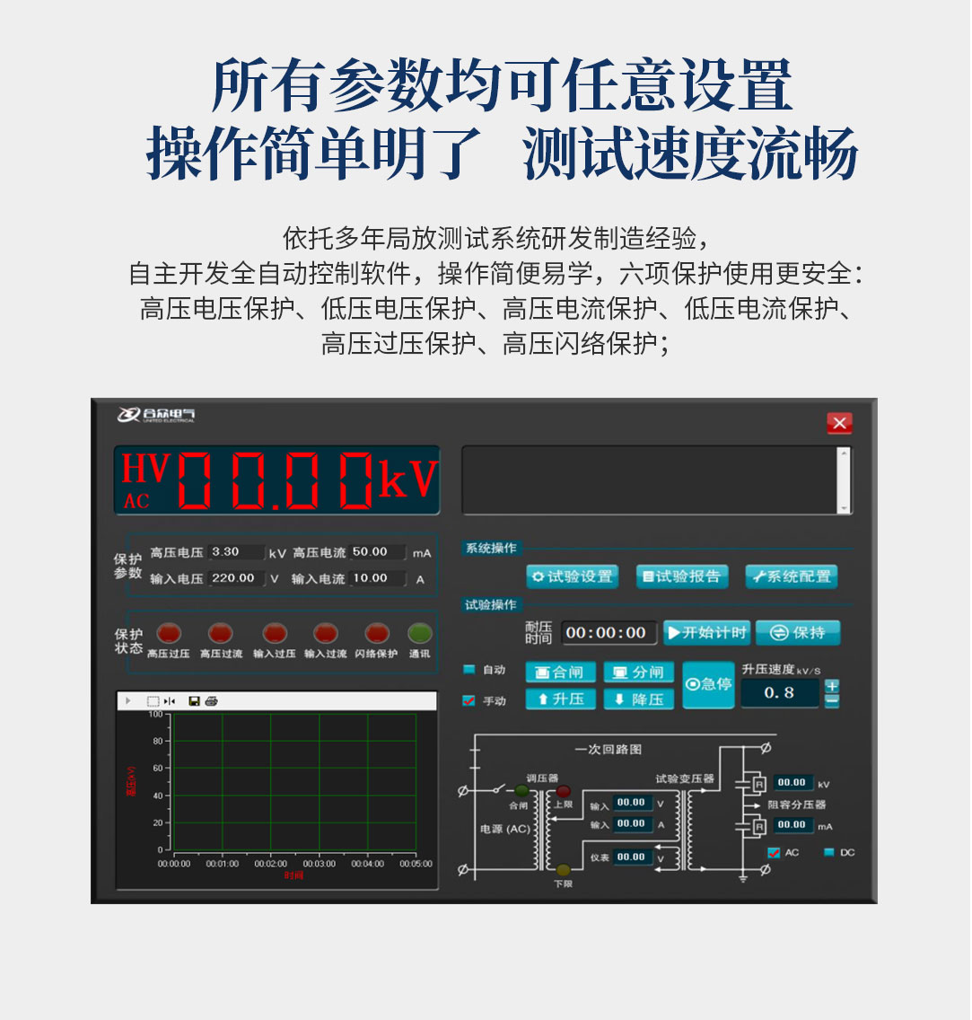 10、可設(shè)置多級(jí)階段式升降壓,設(shè)置好目標(biāo)電壓后,系統(tǒng)自動(dòng)升降壓,無需人工干預(yù),并可實(shí)時(shí)顯示升壓曲線圖。