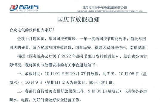 武漢市合眾電氣2022年十一國慶節(jié)放假通知