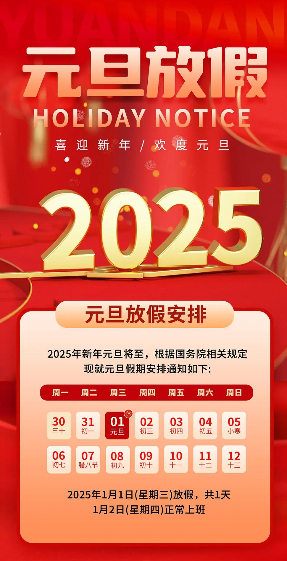 根據(jù)《國(guó)務(wù)院辦公廳關(guān)于2025年部分節(jié)假日安排的通知》,結(jié)合公司實(shí)際情況,現(xiàn)將元旦放假安排的有關(guān)事宜通知如下: